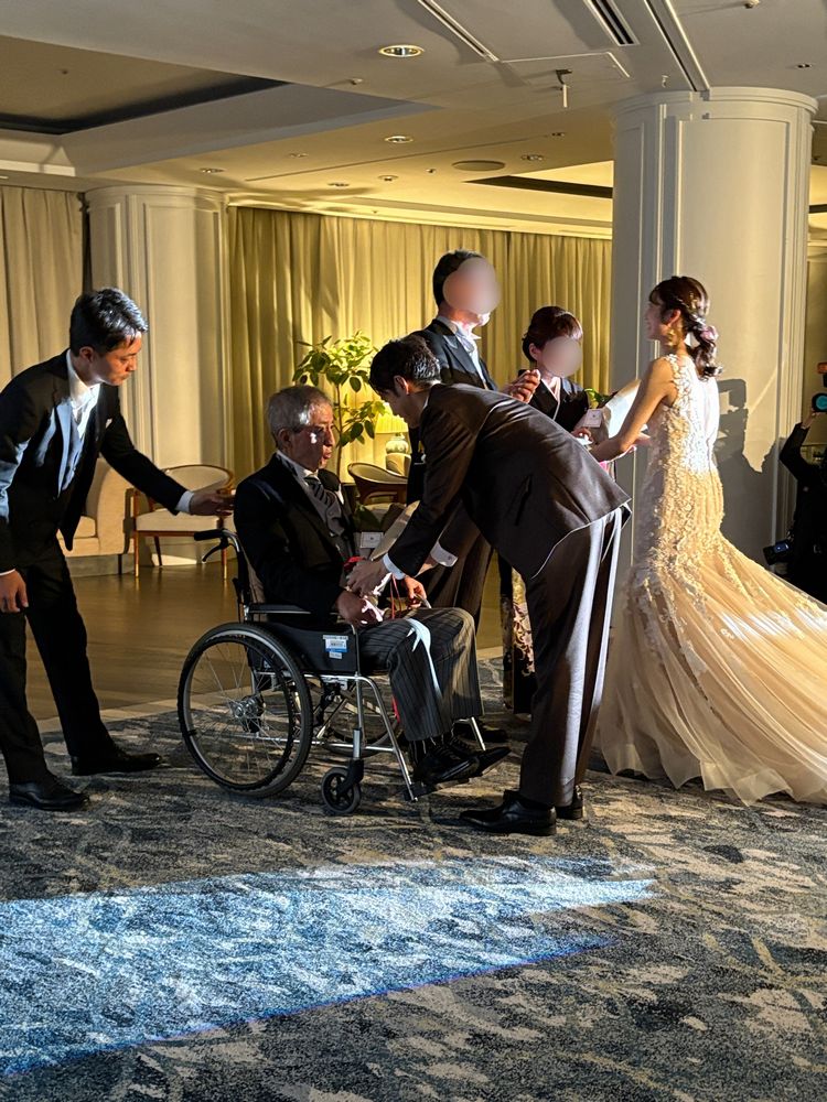 式当日は、会場である「ヨコハマグランドインターコンチネンタルホテル」にて、介護タクシーのドライバーからお引継ぎを受けてサービスを開始いたしました。お父様の出番の際には、お兄様方へお引継ぎするなど新郎様より事前にご指示いただいておりましたので、お兄様方と連携してスムーズに行うことができました。